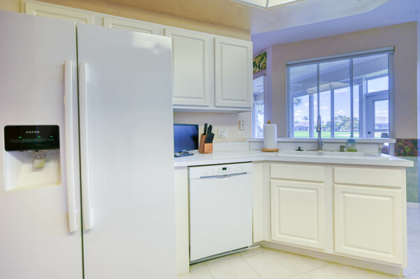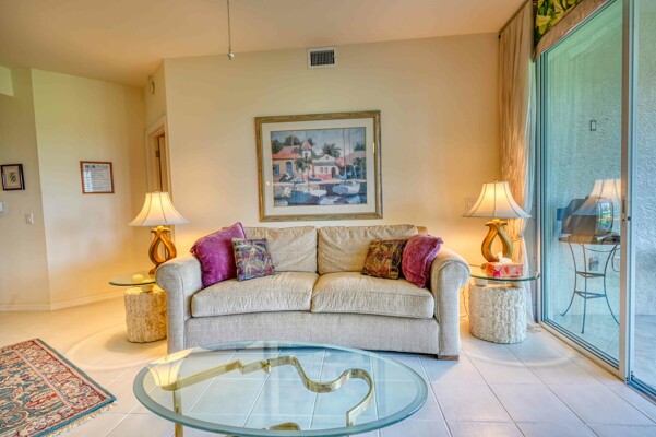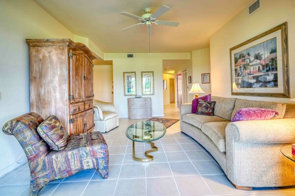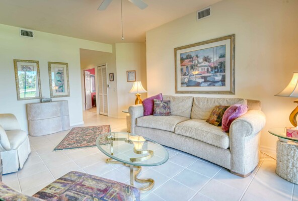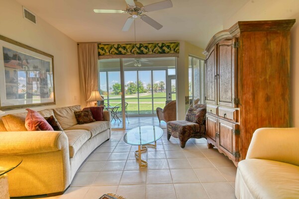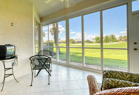 Situated deep in a quiet corner of prestigious Gulf Harbour, located in the socially active community of Grande Cay this 2BR/2Ba +den and garage unit offers a lovely view of the golf course and the lake beyond. It is directly across from the newly refinished community pool and spa, the social center of Grande Cay where residents relax, chat and enjoy the many home-owner parties. The entry foyer opens to the great room that offers an expansive view out onto the golf course and lake. A formal dining room and breakfast nook in the kitchen give you choices to eat casually or with more ambiance. The screened lanai has acrylic shutters, which have 8-times the insulating value of glass so you can relax and enjoy the view year-round, rain or shine, regardless of outside temperature. even in the heat of summer or the brief cold snaps of winter. The shutters are sliders so you can let in the breeze when you want. The primary bedroom also shares the view. Large enough to easily accommodate a king bed. The ensuite bath has twin sinks and a separate tub and shower. Two walk-in closets. Guest bedroom large enough to accept a queen bed and furnishings easily. Large closet. Den has a desk and cabinets. The kitchen has a pantry and plenty of counter and cabinet space. Newer appliances. Convenient laundry room opens to garage. Unit has newer A/C. Just a few steps across the street to the pool Want to get close to the water without going off property. Just walk, bike or drive down to our own Eagle Perch Island on the Caloosahatchee River. Sit and enjoy sunset, admire the boats in the marina or stroll along the walking path to soak in the breath-taking views. If you want big water, it is a short drive to Bunch Beach, Ft. Myers Beach or Sanibel. Pickleball is nearby. Surrounded by restaurants of all types. Close to airport, Twins and Red Sox stadiums. beautiful Lakes Park, the walking trails in Six Mile Cypress Slough and plenty of shopping. The additional Gulf Harbour amenities include golf, tennis, a staffed 2-story fitness center, full beauty salon, marina and two restaurants do require an optional membership. However, several public golf courses and a Planet Fitness are nearby. Unit sold turnkey with comfortable contemporary furnishings. A deep cleaning put the unit in move-in condition. Kitchen and bathrooms could use some updating and price reflects that, but there are no known physical issues so you can handle any projects on your own schedule. Makes this an outstanding opportunity, either for your winter hideaway or as a rental asset.
