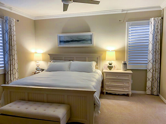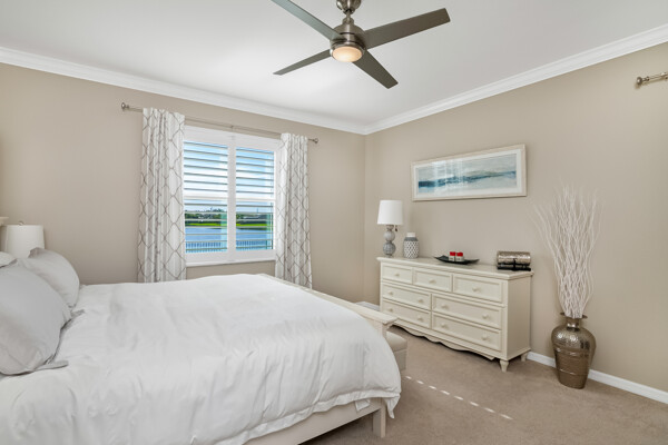 The master bedroom (windows face the lake) occupies the south East corner of the home, and is entered off the family room. The cleverly arranged master bathroom (complete with tub and fully shower) is complimented by spacious closet spaces.