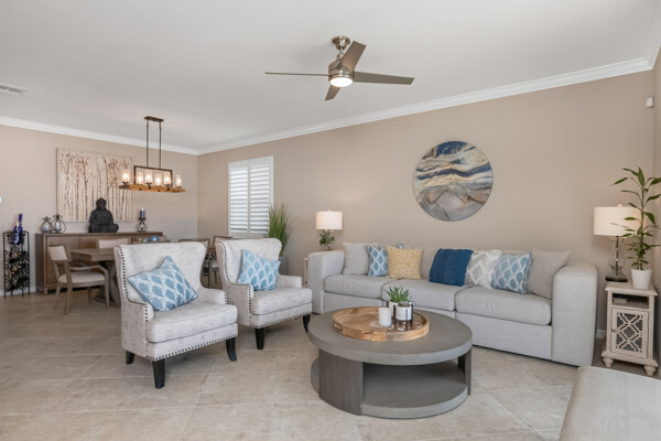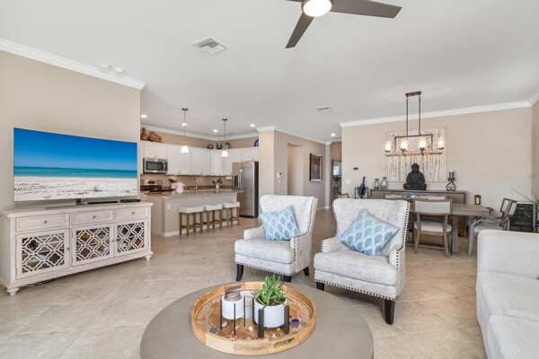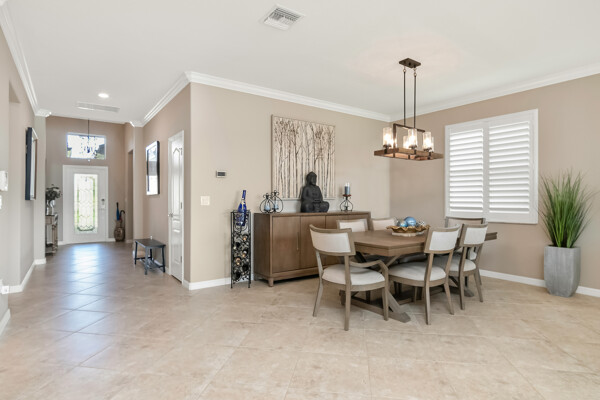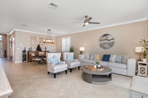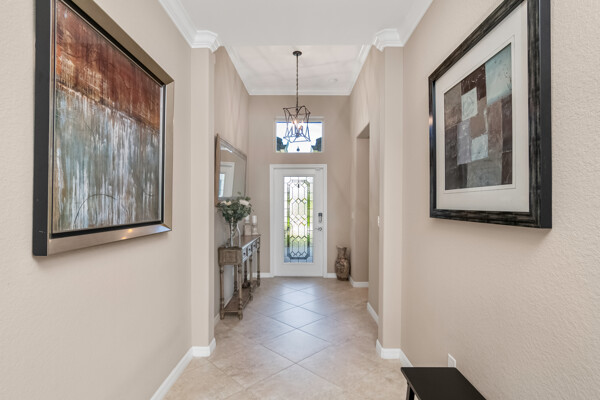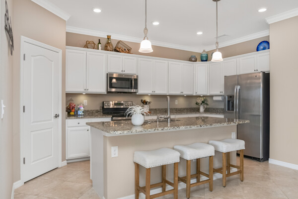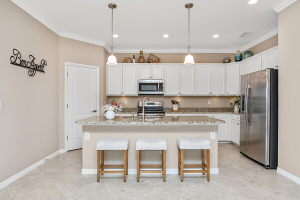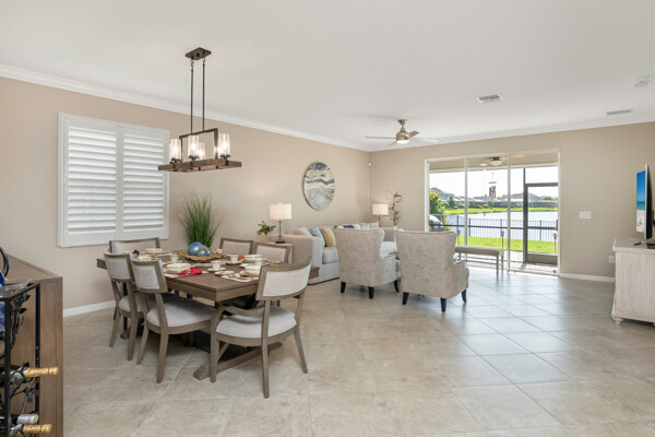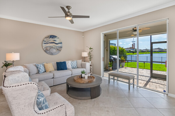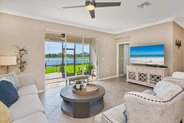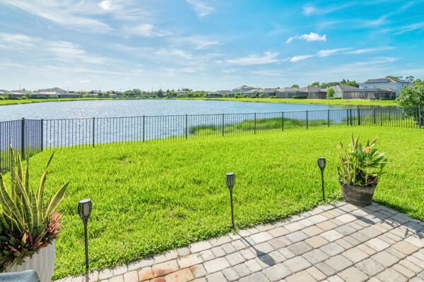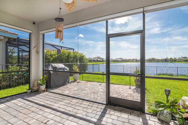 Light, airy, neutral decor, the morning sun rises over the lake (family breakfast and coffee in the enclosed lanai is a must), high ceilings, one level (open plan), crown molding, the most popular builders floor plan (2032 Sq ft under air), secure fenced in yard (future infinity pool upgrade is feasible), outdoor grill space, 2-car garage, laundry room, central kitchen with island sink, granite counters, and stainless steel / black appliances.